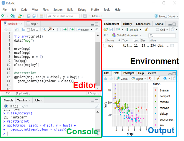 Skript, sodass Sie Ihren Arbeitsablauf nicht ständig wiederholen müssen. Mit der Tastenkombination Cmd/Ctrl + Enter oder bei Anklicken von Run können Sie Code ausführen.Die Objekte der aktuellen R-Arbeitsumgebung - dem Workspace - (Vektoren, Matrizen, DataFrames, …), sehen Sie im Environment (rechts oben).