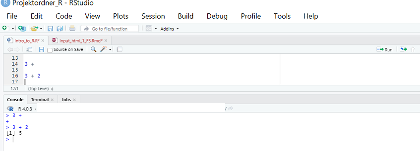 Markieren Sie nun in der Konsole diese Zeile (Bei Ihnen heisst das Verzeichnis sicherlich etwas anders) und kopieren Sie diese in eine neue Zeile im R-Script. Das führt dazu, dass bei erneutem Laden des Skriptes das Arbeitsverzeichnis automatisch korrekt gesetzt wird. Speichern Sie anschliessend das Skript mithilfe des Befehls CTRL+S (während Sie ein Skript erstellen, sollten Sie sehr regelmässig speichern).