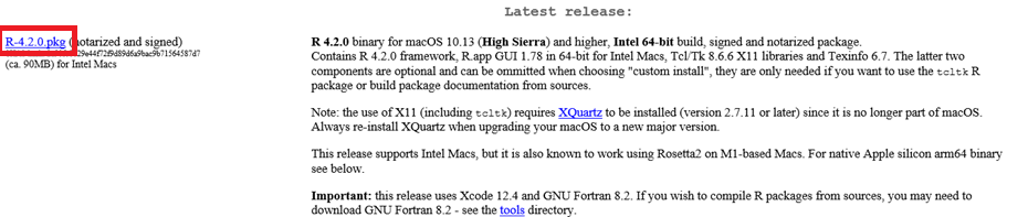 Klicken Sie «install R for the first time» und folgen Sie den Anweisungen. Mac-User können direkt den Link «R-4.2.0.pkg» für die Installation anwählen.
