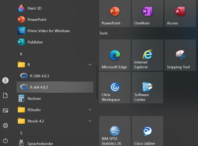 Ist R korrekt installiert, so können Sie es über das Start-Menü links unten anwählen und starten (allenfalls müssen Sie nach unten scrollen, bis die installierten Programmen aufgeführt sind, welche unter ‘R’ gelistet sind).