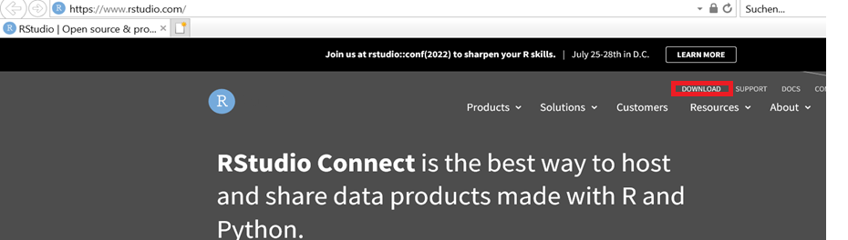 Gehen Sie zur URL: http://www.rstudio.org/ Klicken Sie im Browser rechts oben auf «Download»