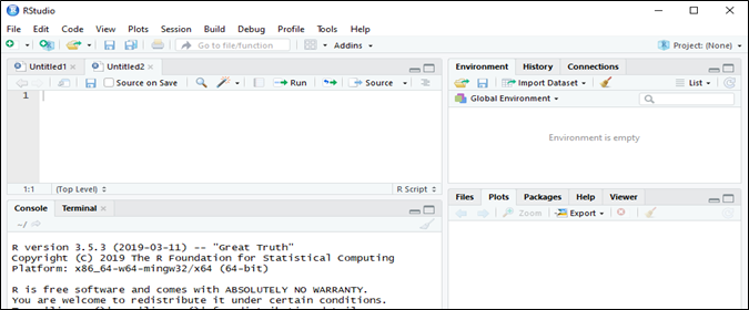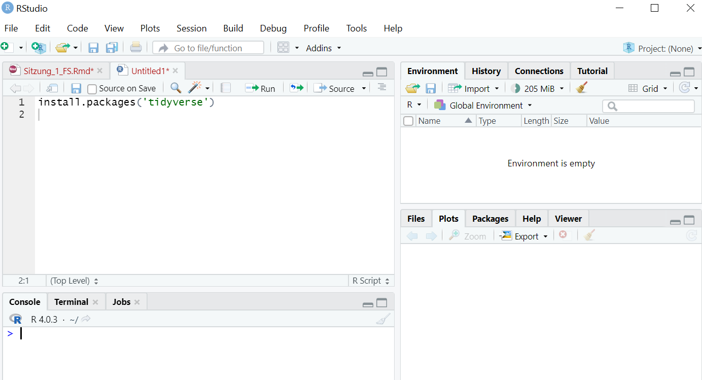 Dabei öffnet sich ein Fenster oben «Untitled1». Dies ist ein noch unbenanntes R-Script. Mit einem R-Script können Sie Ihre Befehle abspeichern und jederzeit wieder ausführen.