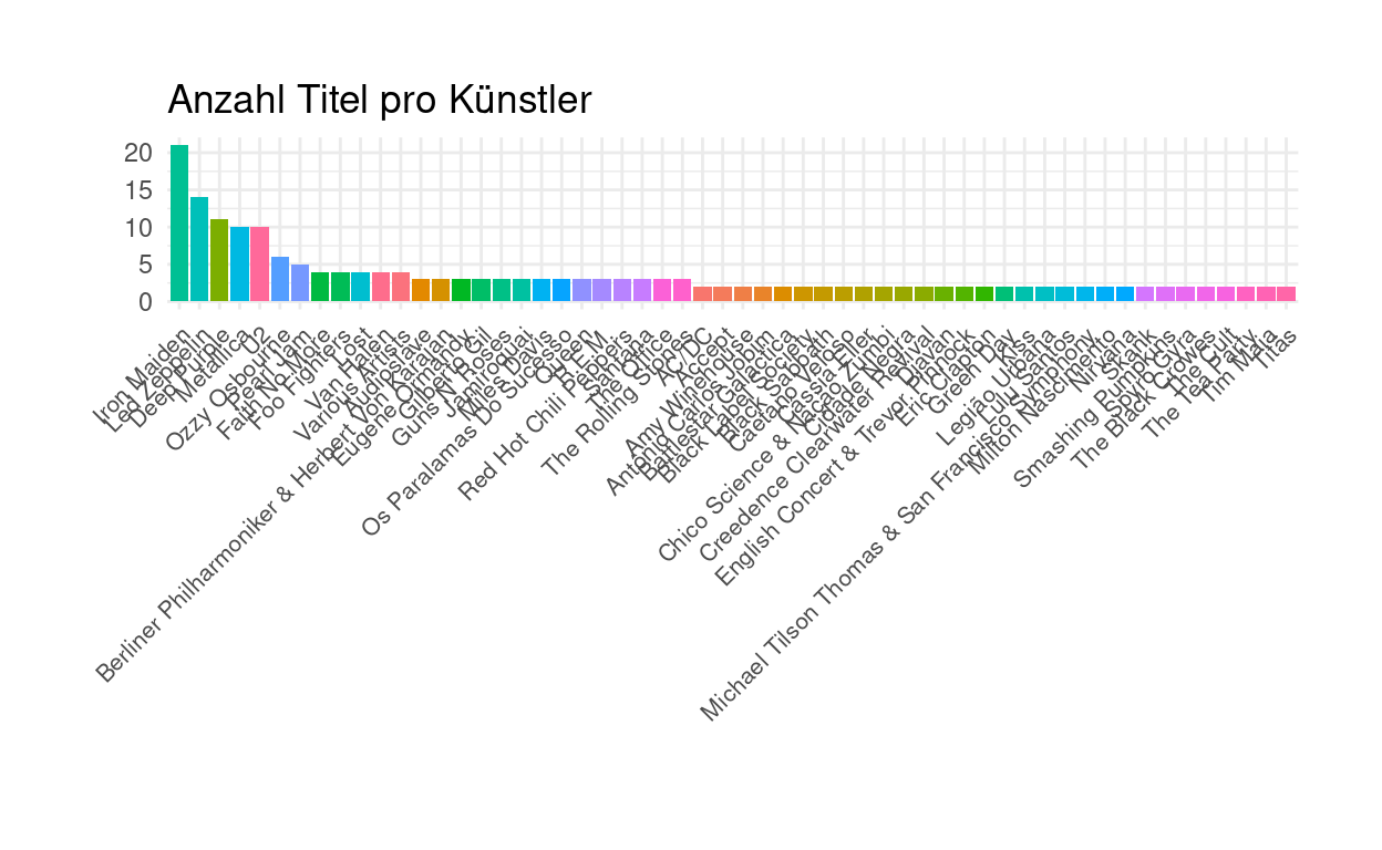 Nun folgen Auswertungen, bspw. in Form einer Grafik. Wir wählen zur Übersichtlichkeit nur Artists mit >=2 Titeln aus.