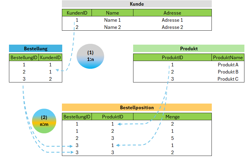 Die Tabellen sind jeweils über “Schlüssel” miteinander verbunden. Dabei hat jeder Datensatz (Eintrag in einer Zeile, bspw. ein Kunde) genau einen “Primärschlüssel” (bspw. “KundenID” in der Tabelle “Kunde”), der einen Datensatz eindeutig kennzeichnet. Sind weitere Schlüssel enthalten, so nennt man diese “Sekundärschlüssel” (bspw. “Name” in der Tabelle “Kunde”, da so der Kundenname nur einmalig verwendet werden kann). Sind in einer Tabelle “Primärschlüssel” einer anderen Tabelle enthalten, nennt man diese “Fremdschlüssel”. Im obigen Beispiel enthält die Tabelle “Bestellposition” die Fremdschlüssel “BestellungID” und “ProduktID” und stellt die Referenz zwischen den Tabellen “Bestellung” und “Produkt” her. Die beiden genannten Fremdschlüssel bilden einen zusammengesetzten Primärschlüssel.