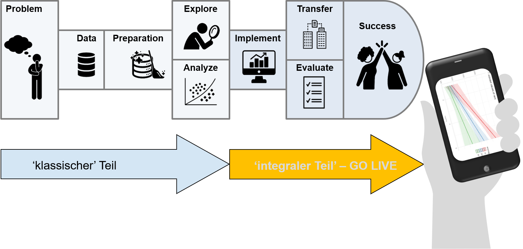 - Computer Science: Der Data-Scientist klärt mit der Informatik / IT der Kundin ab, welche Datenstämme vorliegen und wie die Problemlösung in den Schritten 6-8 bei der Kundin implementiert werden soll - wie erwähnt sind diese Schritte iterativ.