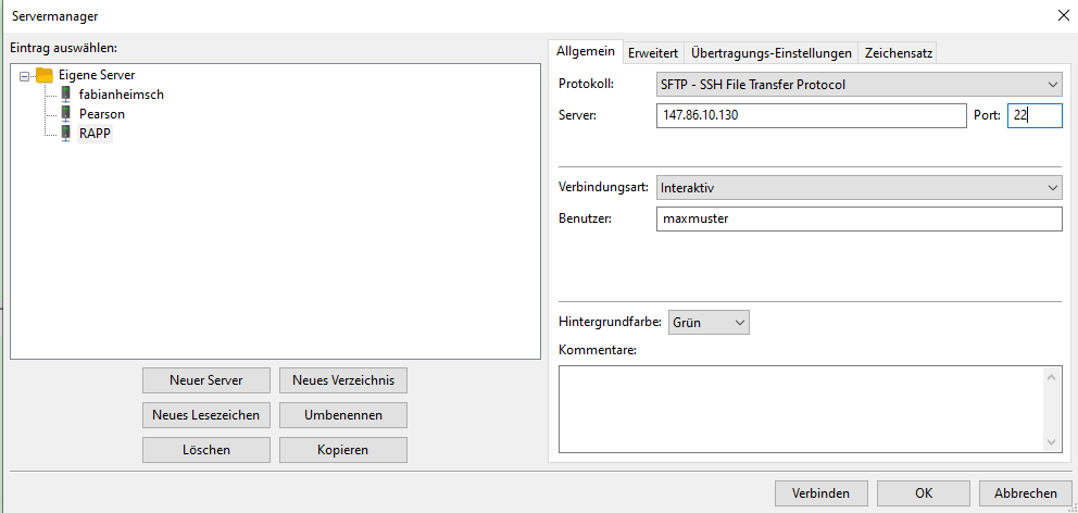 Datei\(\rightarrow\)Servermanagerund wählen anschliessendNeuer Server(wie Sie diesen benennen ist gleichgültig). Als Protokoll wählen SieSFTP - SSH File Transfer Protocolund geben anschliessend unterServerdie IP-Adresse vonRAPPan. AlsPortwählen Sie22und setzen dieVerbindungsartaufinteraktiv. Schlussendlich geben Sie alsBenutzernamenoch den Ihnen zugewiesenen Benutzernamen ein, hier am Beispielmaxmusterund drücken anschliessend aufverbinden. Anschliessend geben Sie das zugewiesene Passwort ein (hier zum BeispielPasswort123).