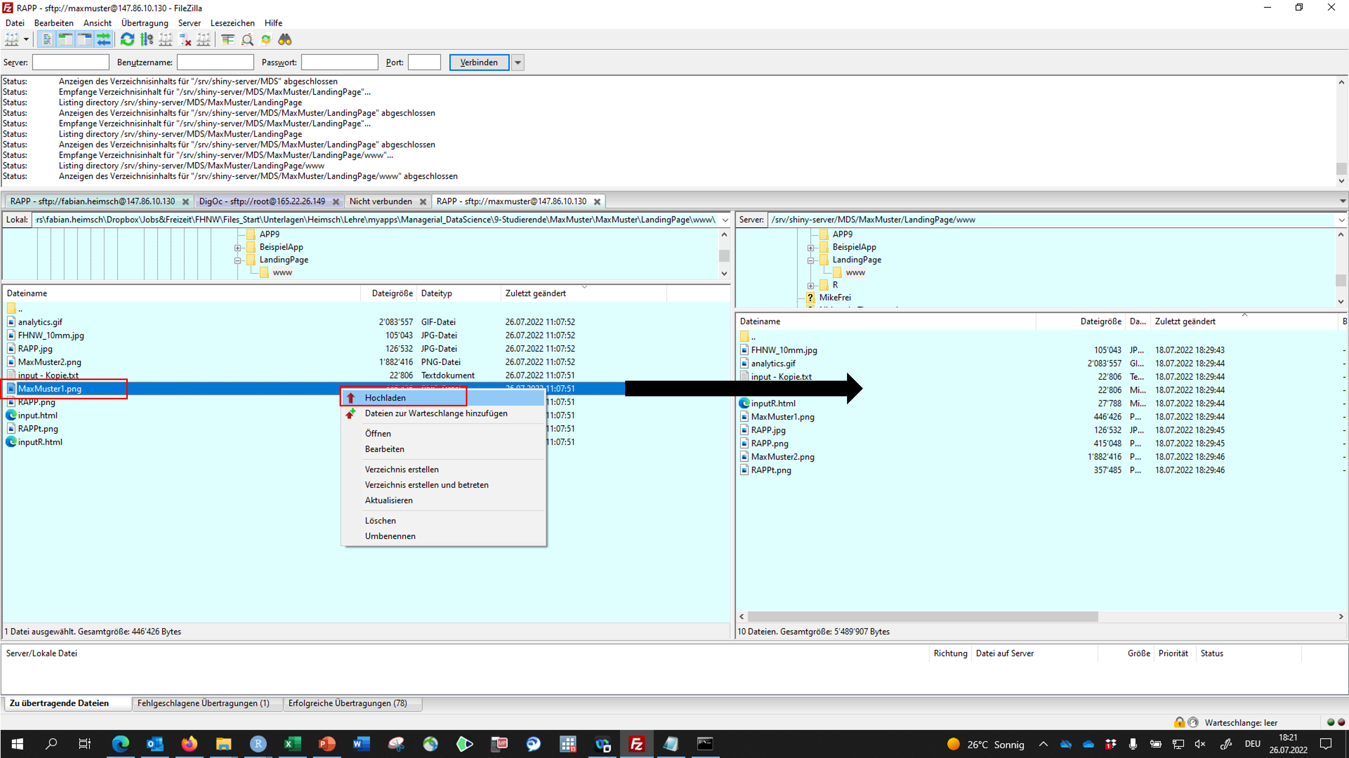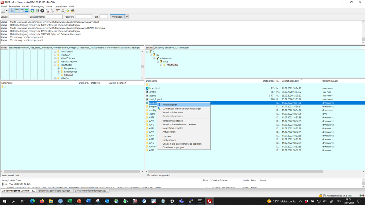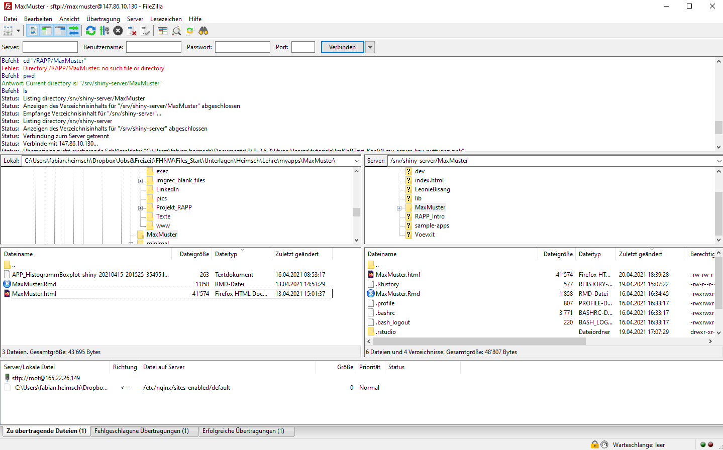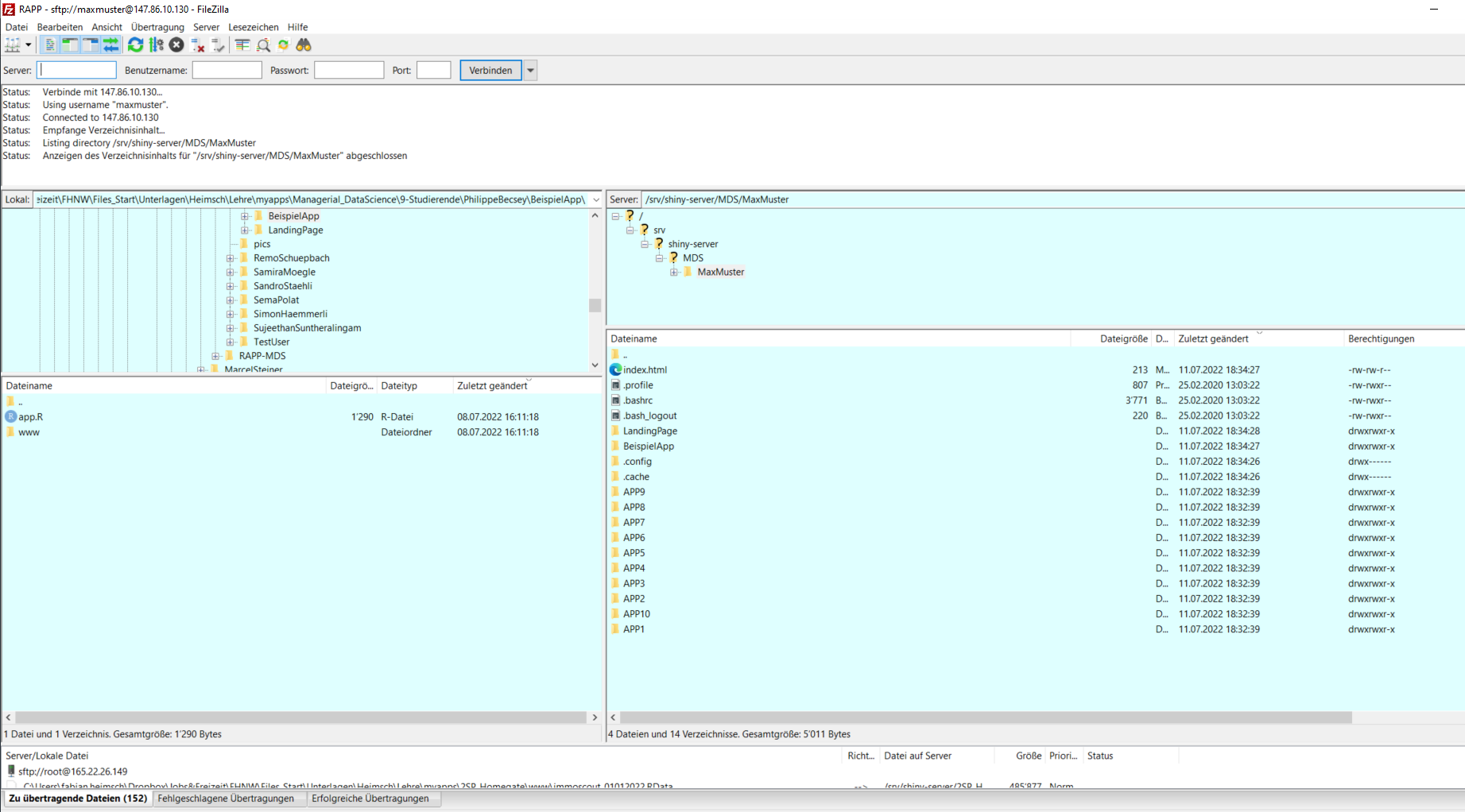 Öffnen Sie wiederum Filezilla und verbinden Sie sich mit Ihrem Ordner auf dem RAPP-Server. Navigieren Sie nun in Filezilla auf der linken Seite zum Ordner, wo sich Ihr R-Markdown Dokument MaxMuster.Rmd befindet. Auf der rechten Seite von Filezilla navigieren Sie nun zum Ordner /srv/shiny-server/MaxMuster/.