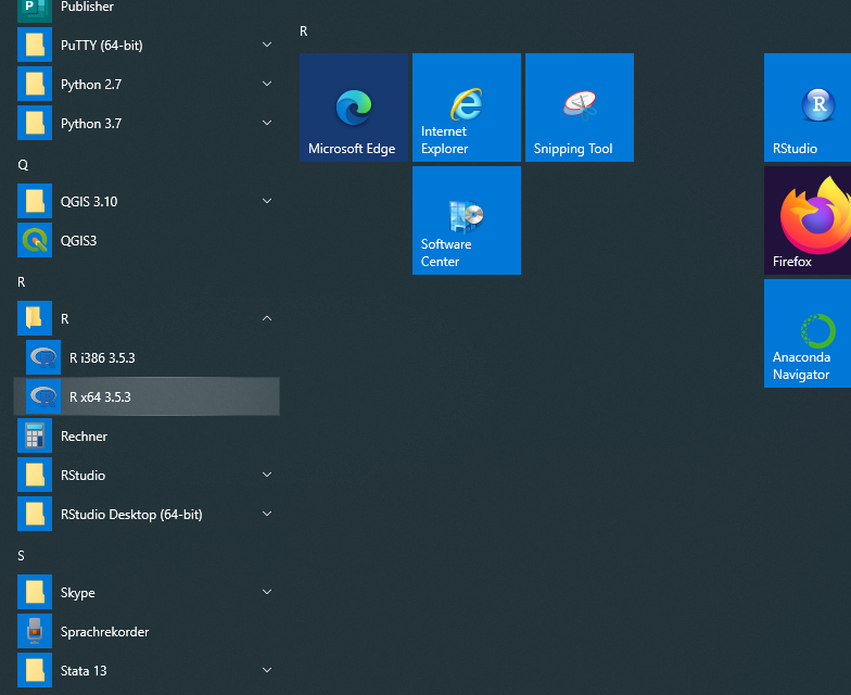 Ist R korrekt installiert, so können Sie es über das Start-Menü links unten anwählen und starten (allenfalls müssen Sie nach unten scrollen, bis die installierten Programmen aufgeführt sind, welche unter ‘R’ gelistet sind).