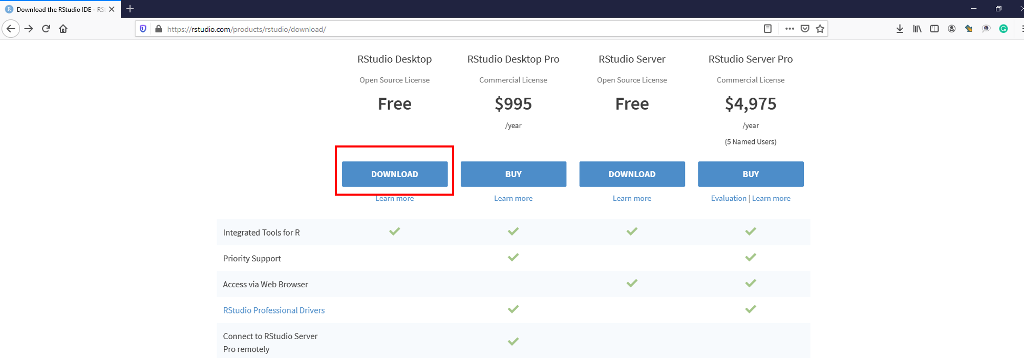 Wählen Sie auf dem folgenden Bildschirm in der Spalte unten links die Version ‘RStudio Desktop’ und klicken Sie auf ‘Download’.