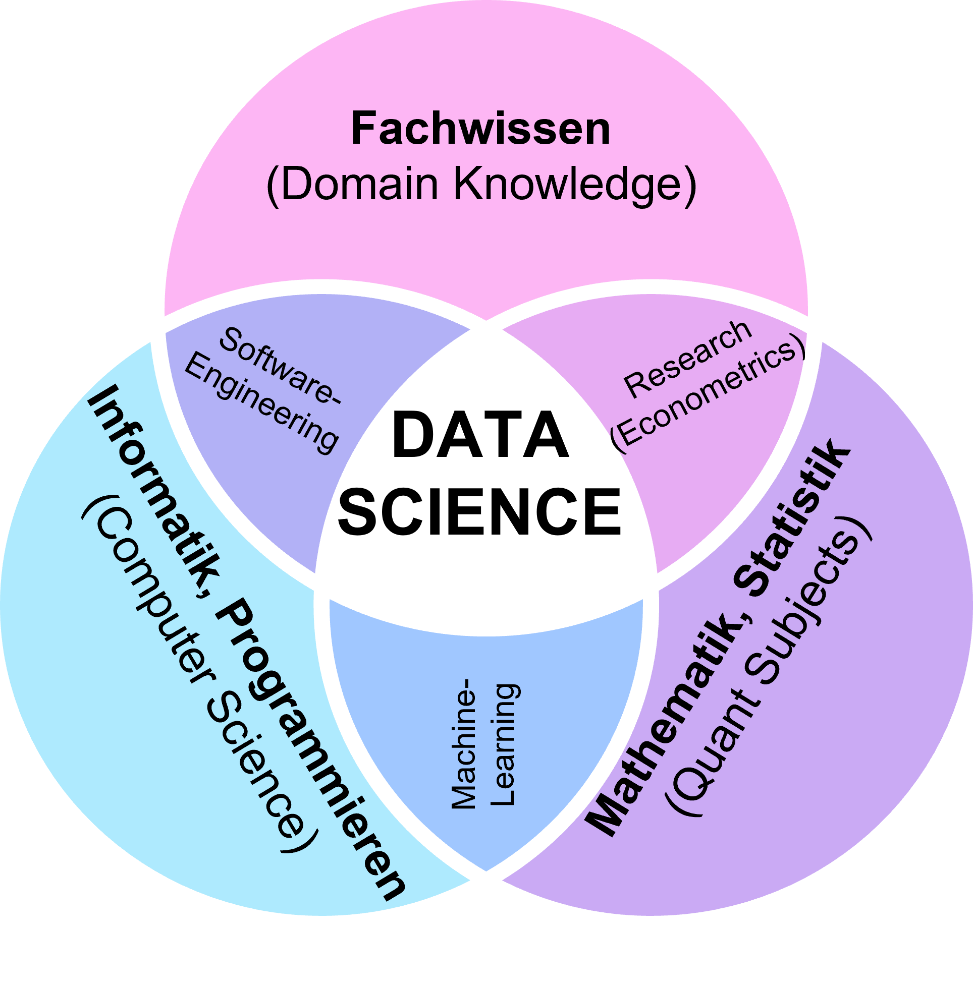Data-Scientisten müssen in allen genannten Feldern (resp. Überschneidungen ) Wissen ausweisen, die Stärken der einzelnen Personen sind jedoch oft sehr unterschiedlich ausgeprägt. Daten-Wissenschaftlerinnen mit universitären Abschlüssen (Universität, beide ETHs) sind typischerweise in den Feldern Computer Science und Quantiative Subjects stark. Von Absolventinnen einer Fachhochschule wird daher erwartet, als dass sie aus mindestens einem von diesen Feldern Wissen ausweisen können und dies mit Domain-Knowledge (Marketing, Finance, etc.) geschickt kombinieren. Eine weitere Stärke von FH-Absolventinnen ist der integrative Umgang mit allen Beteiligten aus allen Disziplinen.