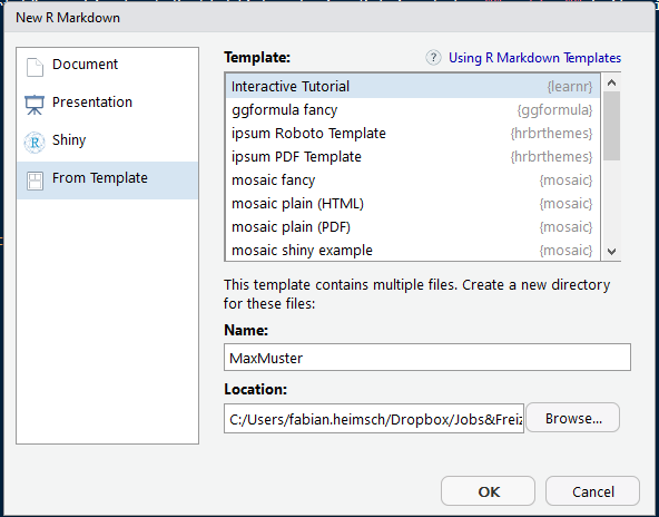 Wählen Sie dann File \(\rightarrow\) New file \(\rightarrow\) R Markdown, anschliessend wählen Sie From Template den Eintrag Interactive Tutorial aus. Als Ordner-Name können Sie zum Beispiel MaxMuster oder App_MaxMuster wählen (oder einfach Ihren Namen), mit Browse können Sie zusätzlich noch wählen, in welchem Verzeichnis der neue Ordner MaxMuster mit der App angelegt werden soll.