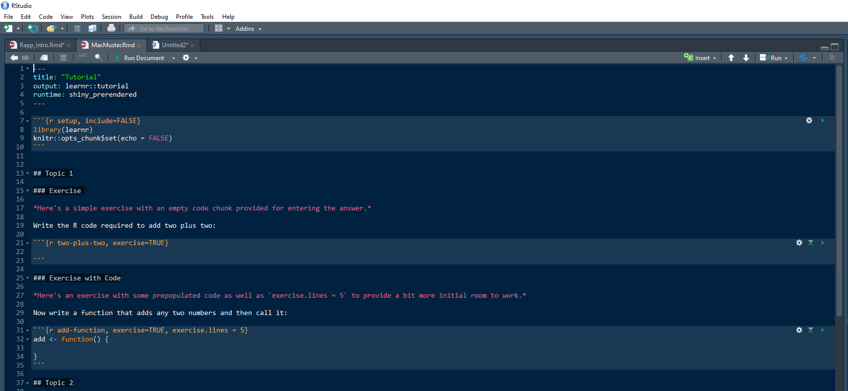 Nun wird entsprechendes Verzeichnis angelegt und in RStudio öffnet sich ein R-Markdown Dokument names MaxMuster.Rmd. Dieses Template ist sozusagen ein Steinbruch für die Entwicklung eines eigenen Tutorials resp. einer eigenen App.