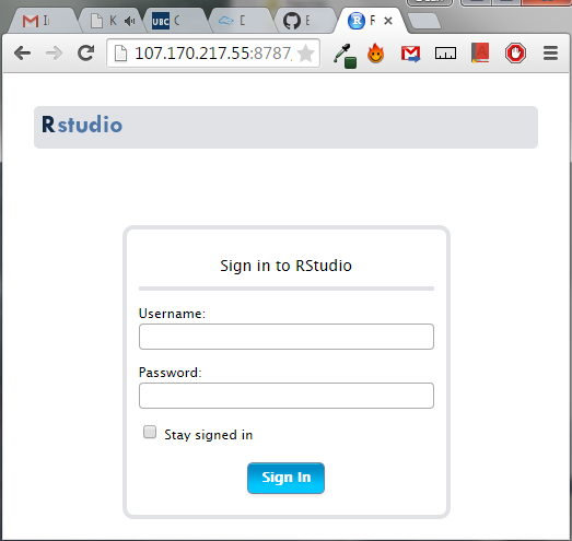 Erledigt! - RStudio benutzt den Port 8787 - somit können Sie sich direkt über einen Browser in ‘ihr’ RStudio einloggen. Um zu RStduio zu gelangen, navigieren Sie nun bitte zu Ihrer Webpage, nämlich http://123.456.1.2:8787 und Sie sollten dann folgendes Fenster sehen, wo Sie sich mit Ihrem Benutzernamen und Passwort einloggen können: