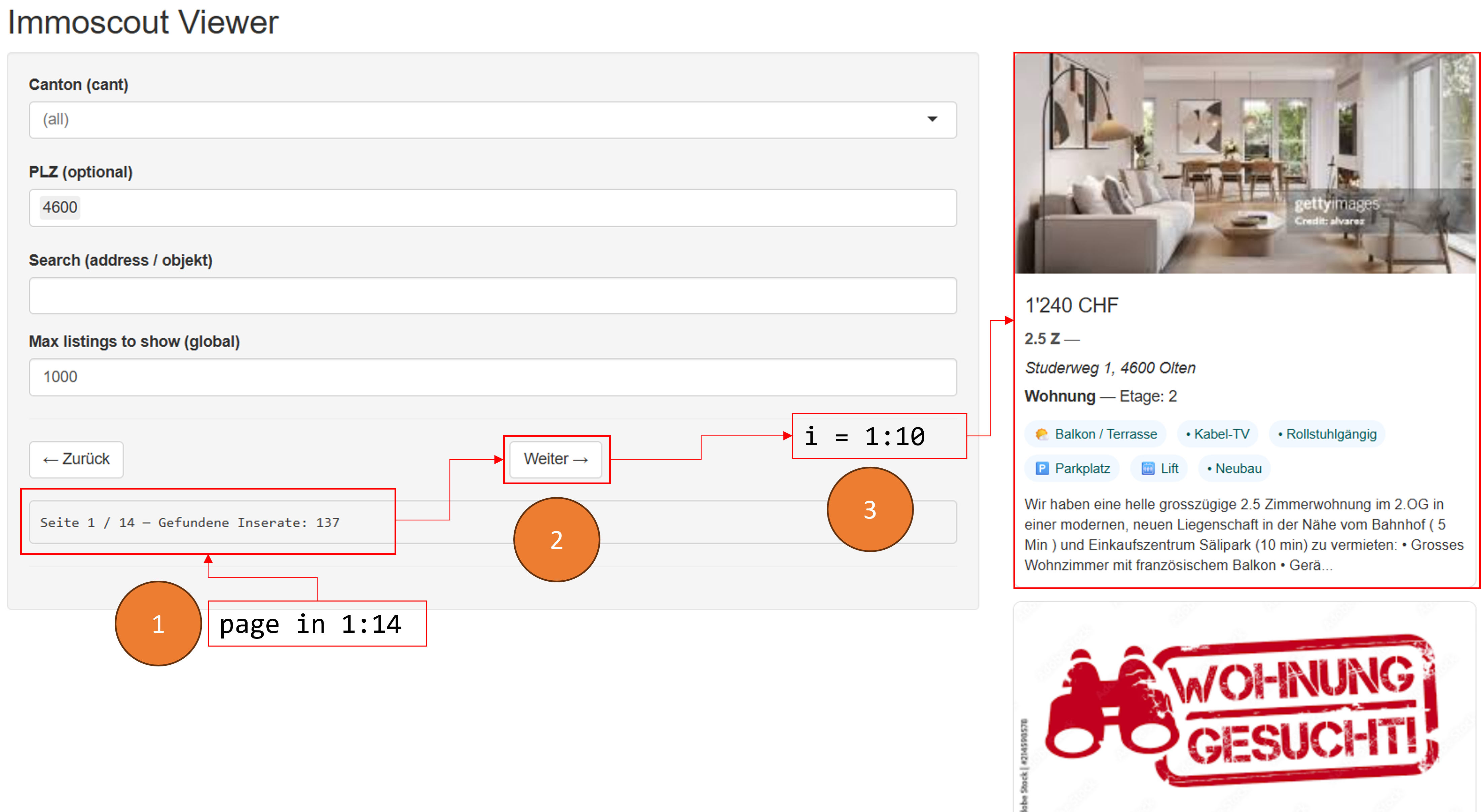 Um Komplikationen zu vermeiden, verwenden wir eine andere Zielseite, nämlich nicht Homegate selbst, sondern eine auf RAPP angelegte Webpage zu Mietpreisen von Wohnungen.