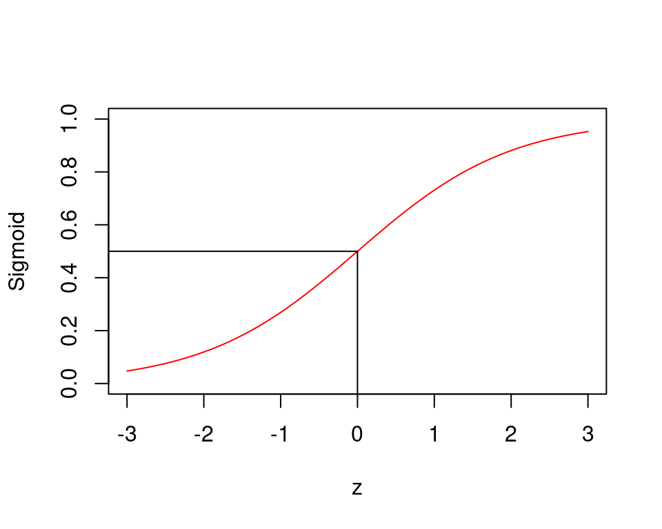 curve(sigmoid, from = -3, to = 3, xlab = "z", ylab = "Sigmoid", ylim = c(0,1), col = "red")