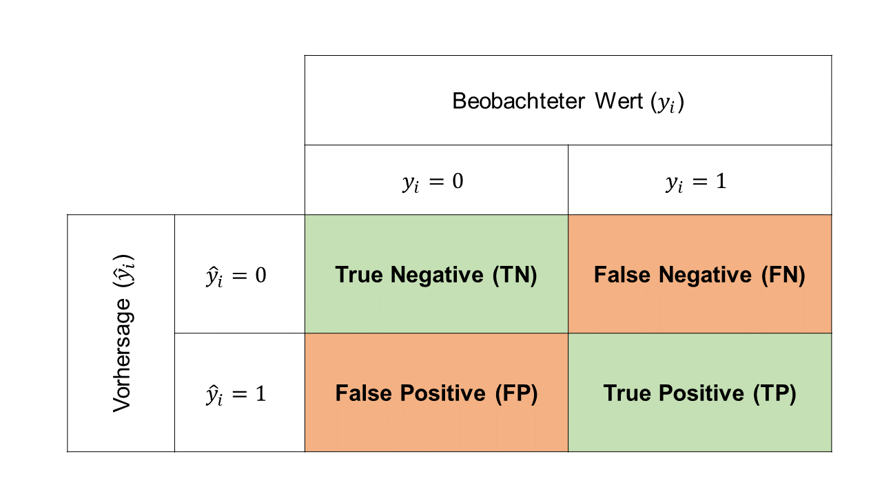 Im einfachsten Fall ist unsere Vorhersage \(\hat{y}_i=1\), falls die geschätzte Wahrscheinlichkeit \(p(y_i = 1 | \mathbf{x}_i) > 50\%\), und sonst \(\hat{y}_i=0\). Hier haben wir einen Threshold von 50% gewählt, aber grundsätzlich können wir auch andere Thresholds wählen (z.B. 20% oder 85%), um von den geschätzten Wahrscheinlichkeiten eine Vorhersage abzuleiten. Dazu später mehr!