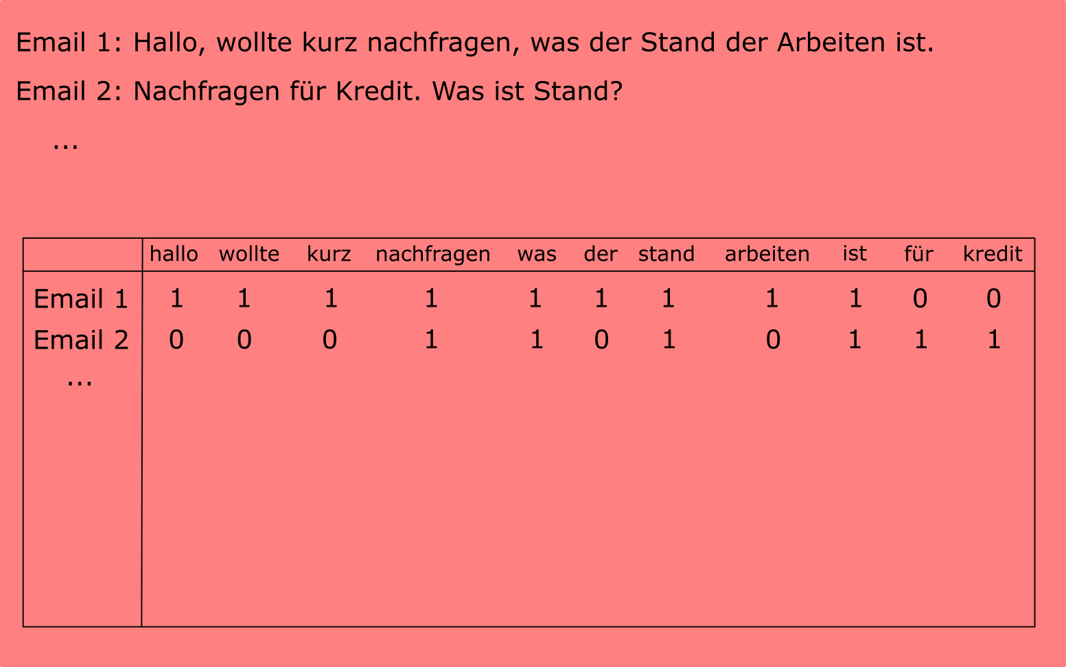 Im Fall von unstrukturierten Daten muss man sich überlegen, wie man die Daten in eine strukturierte Form bringt. Oder in anderen Worten, wie kommt man von einer Email zu einem Input-Daten Vektor \(\mathbf{x}_i\)? Eine Möglichkeit ist der sogenannte Bag-of-Words Ansatz. Dabei geht man folgendermassen vor:
