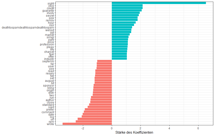 Mithilfe der Bag-of-Words Methode können unstrukturierte Textdaten in einen strukturierten Dataframe (oder eine Matrix) transformiert werden. Am Schluss wird uns natürlich interessieren, welche Wörter zu einer besonders grossen Spam-Wahrscheinlichkeit führen.