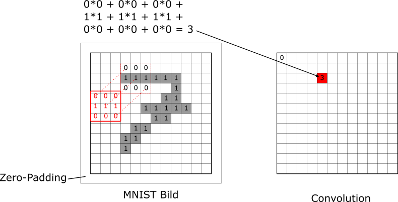 Im folgenden Beispiel schauen wir uns wiederum das Bild der handgeschriebenen “7” an. Der Prozess der Convolution beginnt beim Pixel links oben. Wir legen den Filter über das Bild, so dass die Mitte des Filters genau auf dem Pixel links oben liegt. Dann multiplizieren wir die Werte des Filters mit den darunter liegenden Pixelwerten und summieren die Werte aller Multiplikationen auf. Der resultierende Wert ist dann der Pixelwert links oben im Output (rechte Abbildung, Untertitel Convolution). Damit das auch bei allen Pixels am Rand des Bilds funktioniert, umrahmen wir das Bild mit Nullen. Dieser Schritt wird in der Praxis Zero-Padding genannt. Wir sehen in unten stehender Abbildung, dass die Convolution für das Pixel links oben zu einem Wert von 0 führt: