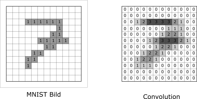 Um uns den Unterschied zwischen klassischen ANN und CNN noch klarer zu vergegenwärtigen, gehen wir kurz zum vereinfachten MNIST Beispiel zurück. Folgende Abbildung zeigt, was in einem ANN und einem CNN mit dem 12 x 12 Bild einer handgeschriebenen “7” passiert: