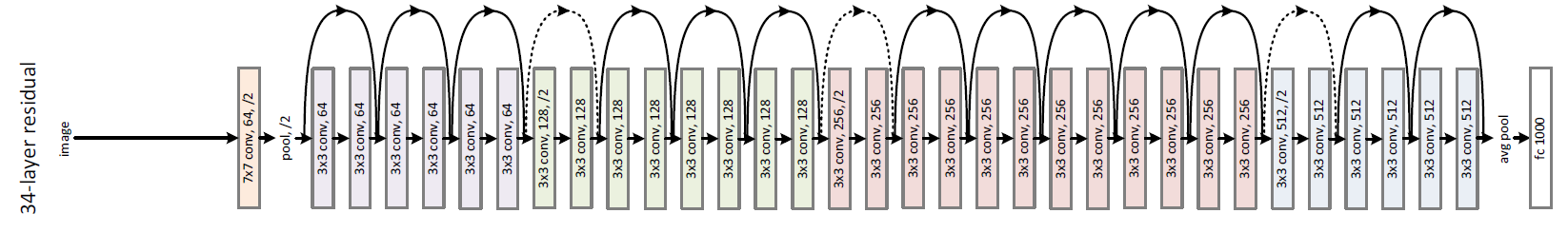 Die Architektur des ResNet34 sieht wie folgt aus (Quelle: He et al., 2015):